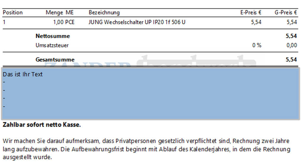 Wenn Sie einen Textbaustein unter Gesamtsumme einfügen möchten, in dem Sie den Kunden auf die Gesetzgebung hinweisen möchten, dann gehen Sie bitte wie folgt vor:
