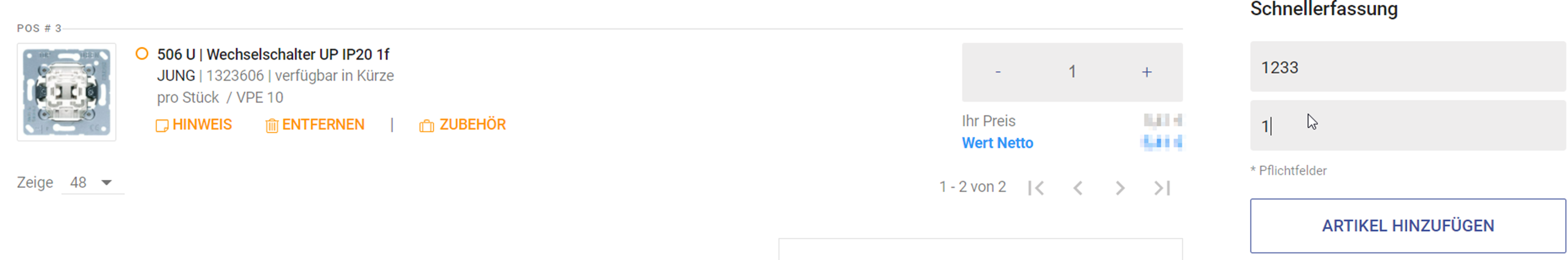 Geben Sie in dem Feld "Artikelnummer, Ihre Nr., EAN" Ihre Artikelnummer ein und bei der "Menge" Ihre gewünschte Menge.