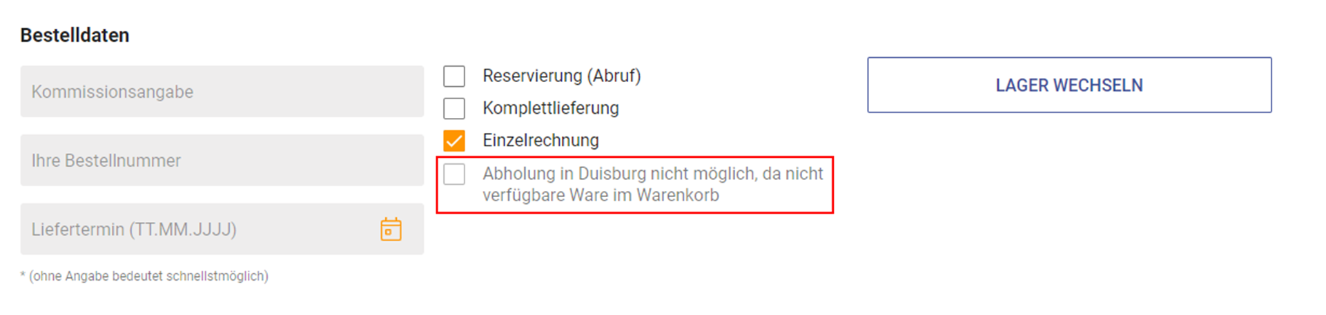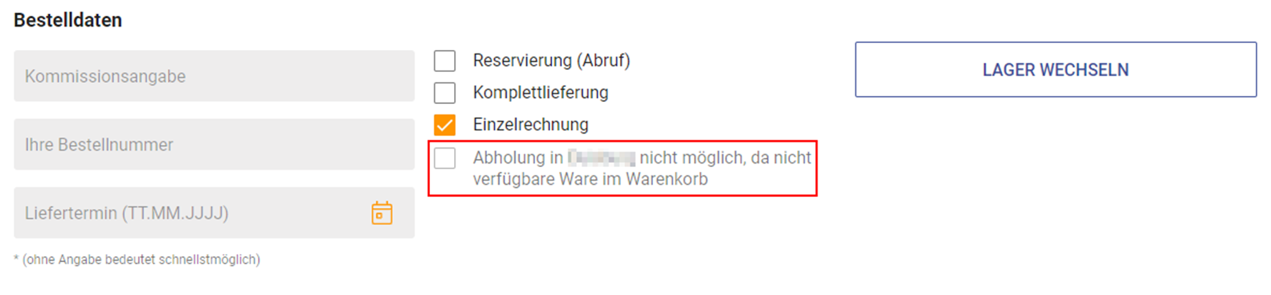 Die Ware steht nicht zur Abholung bereit, dann steht hier folgender Hinweis: "Abholung nicht möglich, da nicht verfügbare Ware im Warenkorb".